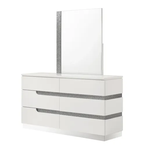 Looking for a stylish space-age addition to your bedroom? Consider this dresser. Featuring finished drawer interiors, this drawer evokes a contemporary look with a white gloss laminate water-resistant finish and crushed crystal accents. With a total of six drawers, it has plenty of room to store your most valued possessions.