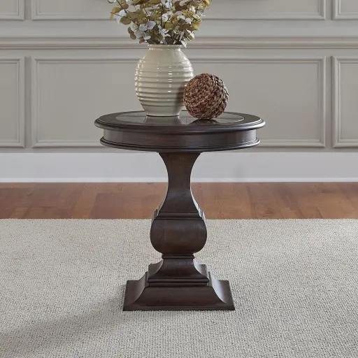 A captivating fusion of elegance and architectural style, the Provence Park round end table is sure to add a touch of sophistication to your living space. Meticulously crafted using Rubberwood solids and Split Heart Hickory veneers, this piece features a Chateau Brown finish. The star of this table is its beautiful blue stone insert, nestled on the top, creating a stunning focal point. The vibrant hue of the stone not only adds a pop of color but also infuses a sense of opulence, elevating the table into a work of art. Supported by an architecturally styled square turned pedestal base, the table exudes a timeless charm. This base is not merely a support structure; it