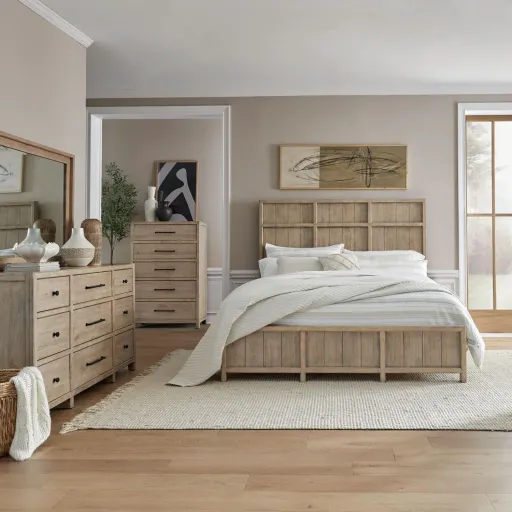 Crafted from Poplar solids and Rustic Flat Cut Birch veneers in a Barley Buff finish, this queen panel bed, dresser, mirror, and chest set blends timeless style with thoughtful details. The bed features score lines on the headboard and footboard, creating a charming planked effect, while picture frame molding adds depth and dimension. The dresser and chest’s clean lines and flat drawer fronts are softened by canted parting rails, and includes soft-closing drawer guides, premium felt-lined top drawers, and cedar-lined bottom drawers for elegant storage. Complete the look with the landscape mirror, featuring a 1-inch beveled edge and bolt-on supports for secure attachment. This queen panel bed, dresser, mirror, and chest brings refined craftsmanship and sophisticated charm to your bedroom.