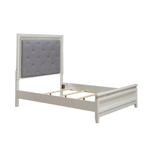 This stunning queen-sized bed is the epitome of glamour, featuring a beautifully upholstered panel headboard and footboard in a gorgeous pearl white finish. The headboard is adorned with elegant tufting, adding a touch of sophistication to the overall design.