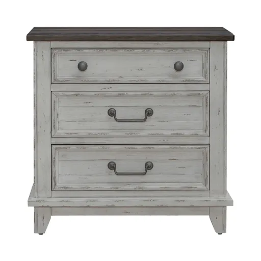 Transform your bedroom with our farmhouse style three-drawer nightstand, seamlessly blending elegance with functionality. Features soft-closing side-mounted drawer guides, ensuring a smooth and silent experience every use. Crafted with high-quality wood and premium felt-lined top drawers, this piece offers ample storage space while keeping your delicate items safe and organized. Finished in Riverstone White, Tobacco Brown, and with Custom Antique Pewter Knob Hardware, this nightstand sends out vintage charm and timeless attraction, while the cedar-lined bottom drawers provide extra protection for your belongings. Equipped with a built-in charging station where you will be able to use two AC outlets, one USB port, and one USB-C port, keeping your devices powered and within reach throughout the night. Whether in a farmhouse-inspired bedroom or a transitional space, this piece embodies quality craftsmanship and on-trend design, offering both style and practicality in one elegant piece