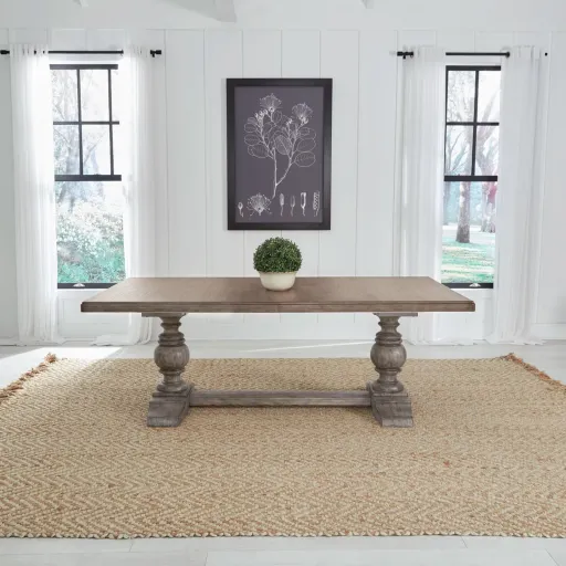 Designed to entice a sense of calm and tranquility into interior spaces, the River Place trestle table strikes the perfect balance of life on the coast and a comfy home tucked away in the hills. Crafted of Pine solids and veneers, this table features a heavily distressed Riverstone Grey and Tobacco finish. The trestle table includes a removable and self-storing eighteen inch leaf on an easy glide leaf track system to make expansion a breeze. The top offers softly rounded edges with step molding that flow to the heavy turned pedestals with a center trestle to ensure stability. The River Place trestle table creates an inviting airy atmosphere in your home while providing comfort in your own private getaway.
