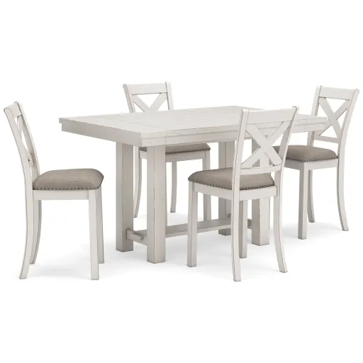This counter height dining table with 4 matching barstools is sure to impress come mealtime. With its antiqued white finish and a planked effect tabletop that extends for additional seating, farmhouse-style dining has never been so fashionable. All that’s missing is you and your family.