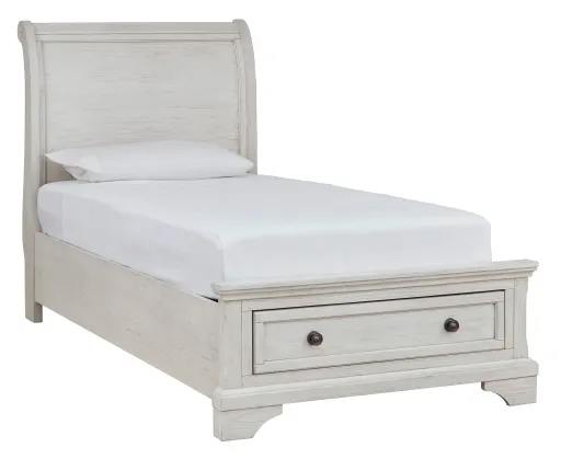 Elegant, timeless furnishings take your bedroom to the next level. Nothing does that better than this twin sleigh bed with storage footboard. The antiqued white finish with a wonderful grain texture radiates sophistication, while the storage drawer with dark bronze-tone knobs add a sophisticated touch. Rounding things out, the subtle curve of the headboard keeps the look polished and poised.