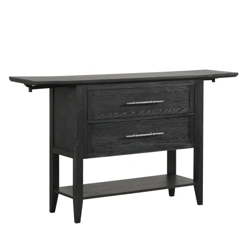 The Sable Crest Drop Leaf Server is a versatile and durable piece designed to enhance both the style and functionality of your dining space. Built from solid Rubberwood and premium engineered woods, and finished with real Oak wood veneers, it offers the lasting strength of real wood combined with enduring beauty. The sophisticated ebony sable finish, applied through a meticulous multi-step brush technique, highlights the natural grain and unique characteristics of the wood, adding depth to your dining area. The transitional design blends contemporary clean lines with subtle farmhouse charm, making it suitable for a variety of interior styles. This server is not only stylish but also highly functional, featuring two spacious storage drawers, an open shelf for easy access, and an extendable leaf that transforms it into a convenient buffet server. Its compact size and adaptable design make it perfect for use in entryways and hallways as well, offering a practical and attractive solution for any space that needs a touch of both style and utility.