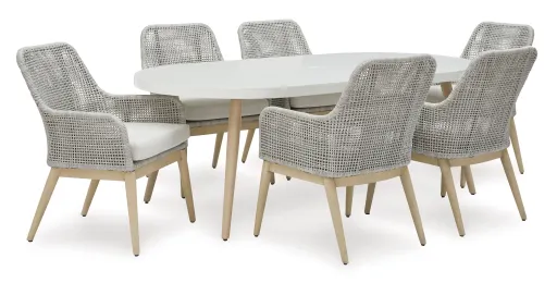 This dining table invites your casual contemporary style outdoors. With an elegant faux stone top, it expertly marries refined design with durability. At this table, breezy summer mornings and cold winter nights are made all the more enjoyable. Dining arm chairs are made with resin wicker in a chic neutral hue, which expertly marries refined design with durability. Breezy summer mornings and cold winter nights are made all the more comfortable with high-performance Nuvella+™ fabric covering the seat cushion.