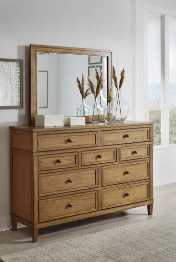 Taking a timeless approach to bedroom beauty, this dresser with mirror brings easygoing elegance to the everyday. With its light brown wood tone, it seamlessly slips into your room’s aesthetic. Dark bronze-tone pulls accent the assorted storage drawers, adding to this dresser