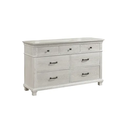 The Silver Sands Dresser combines durability and quality construction, crafted from solid pine, manufactured woods, and oak wood veneers for a strong and stable piece. Its transitional style merges clean, simple lines with a rustic wood finish, creating a calm and inviting atmosphere. The misty gray finish, achieved through a meticulous multi-step, hand-applied process, offers a light, weathered look that highlights the natural grain and mineral patterns of the wood. Elegant design features, including a raised base, full return and dentil moldings, and contrasting hardware, add a sophisticated touch. Heirloom-quality drawers with dovetail joinery and three-stage steel ball glides ensure smooth, full-extension operation and can support heavy loads. With seven spacious drawers, including velvet-lined top drawers to protect delicates, this dresser provides ample storage for clothing essentials. Combining style, durability, and functionality, this dresser is a practical and elegant addition to any bedroom.