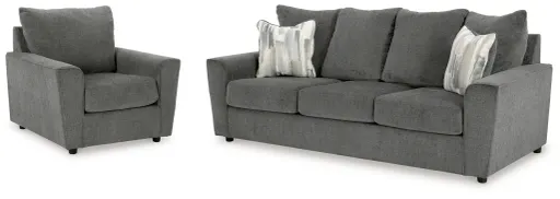 What’s new in neutrals? Shades of gray, of course. Embrace the sophisticated design trend with this gorgeous sofa that offers a clean-lined, contemporary style at a comfortably cool price. Sure to lift your spirits, the plush chenille fabric is fabulously neutral. Contemporary flared arms give it a distinctive flair. This sofa also arrives with two cool brushstroke accent pillows to elevate the taste and comfort level. Matching chair also included.