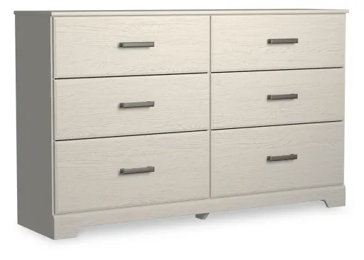 With its clean-lined look and modern attitude, this dresser is a fresh style awakening. A crisp, white hue over subtle replicated wood grain easily complements other furniture finishes. Smooth drawer fronts with antiqued pewter-tone handles complete the aesthetic.