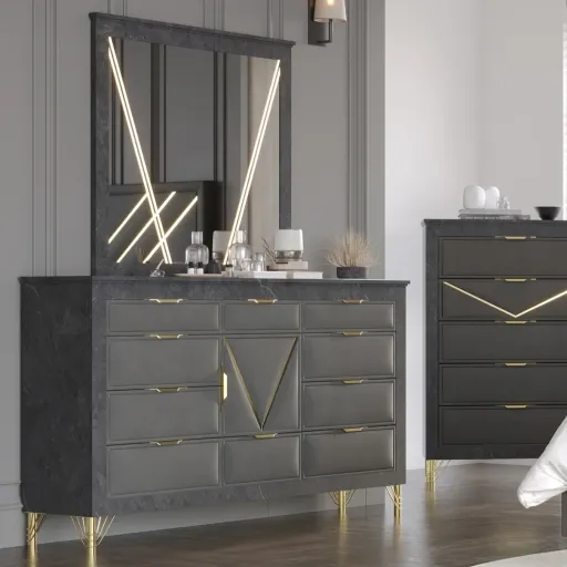 This stunning dresser and mirror set is a masterclass in timeless elegance, blending premium manufactured woods with a luxurious, eco-friendly gray marble laminate. The result is a statement piece that exudes sophistication and glamour, perfect for those who appreciate transitional style with a touch of glamour. With 10 spacious drawers, this dresser offers ample storage for your belongings, keeping your bedroom clutter-free and organized. The drawers feature smooth Kenlin ball-bearing glides, ensuring effortless opening and closing, and are constructed using four-corner English dovetail joinery for exceptional durability. The built-in lighting adds a touch of luxury, providing a warm and inviting ambiance to your bedroom. The gray wood tone and luxurious gray marble laminate create a harmonious color palette that will complement a variety of bedroom decor styles. This dresser and mirror set is not only visually stunning, but also built to last, making it a valuable addition to your home. The mirror adds a final touch of glamour, completing the overall look and feel of this exquisite piece of furniture.