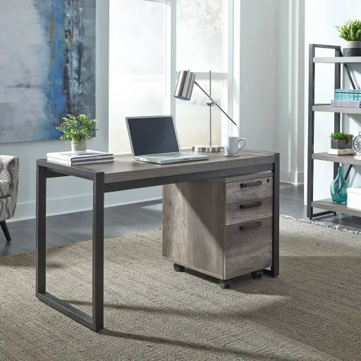 Work from home or your office in style with the Tanners Creek 2-piece desk set. Crafted of a rubberwood solid frame and melamine, this set consists of a writing desk and file cabinet in a Greystone finish. The writing desk features open ends finished in dark pewter metal. The file cabinet features three full extension drawers with the bottom drawer doubling as lateral file storage, the ability to be locked, casters for easy maneuverability, and is accented by dark pewter bar pull hardware.
