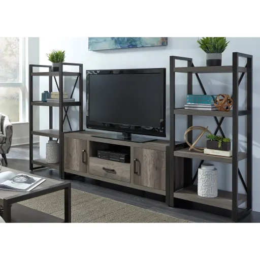 Tanners Creek Entertainment Center with Piers is sure to bring the whole family together. This entertainment center is scratch resistant, thanks to the use of melamine. 63" tv console features an open compartment for components and two center drawers that are flanked by two doors, accented with a dark pewter metal finish.