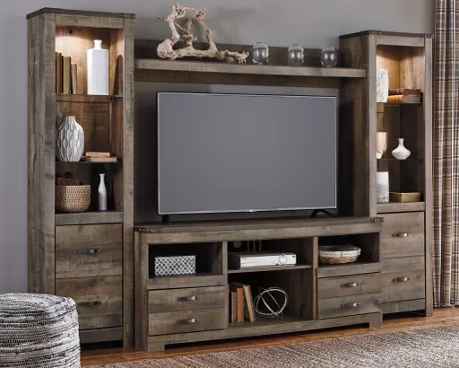 Entertain a rugged yet refined sense of style with this 4-piece entertainment center. Its rustic finish and plank-style details pay homage to reclaimed barn wood, while metal banding with nailhead accents infuses a touch of industrial cool. Ultra-clean lines ensure a look that can go from the country to the city and feel equally at home.