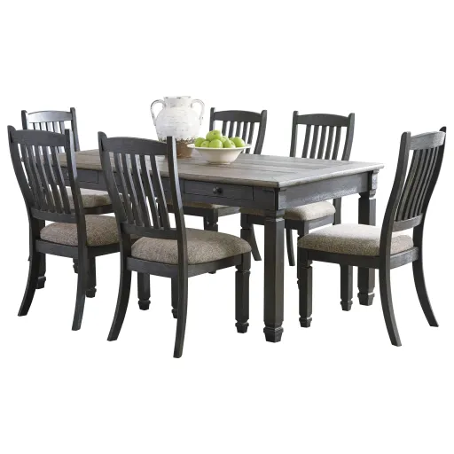 Create a charming dining room with an inviting ambiance with the addition of this relaxed vintage seven piece table and chair set. The two-tone finish is captured by using a combination of Oak and Acacia for an eye-catching contrast. Each chair has an upholstered seat for added comfort. This table offers six convenient drawers for storing small dining room items.