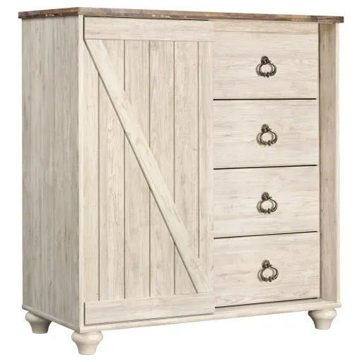 A rustic plank-style top, a plank-style sliding door, and a white finish give this dressing chest a cottage appeal. It features bun feet and ring pulls in an antique brass finish for a vintage-inspired design element.