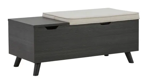 The clean profile of this small storage bench makes an entrance anywhere and everywhere you place it. Replicated blackened wood finish with a grayed textural grain and tapered wood legs lend a fresh flair. Adding form and function, both tops are removable to expose hidden storage underneath. A must-have piece for small spaces.