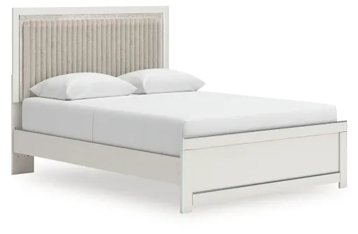 If glitz and glam are your jam, you’re gonna love this queen upholstered panel platform bed. Gleaming glitter and dazzling chrome-tone touches are paired with tufted gray faux fur for a stunning pop of pizzazz. Loaded with chic flair and serious sparkle, it