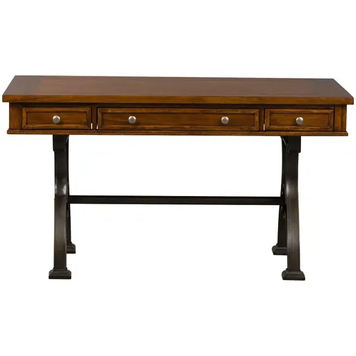Work from home or the office in timeless style with the Arlington House writing desk. Crafted of poplar solids with acacia veneers and metal tube framing, this piece features a cobblestone brown finish and antique pewter knob hardware. The writing desk features three full extension drawers including a flip down keyboard tray, and a metal industrial style base.
