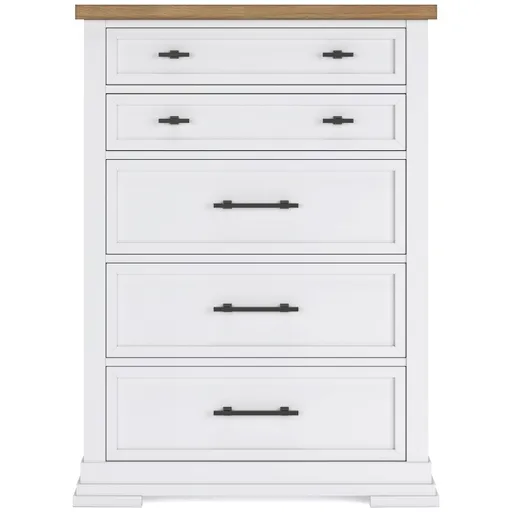 Casual style with substance. This two-tone chest of drawers raises the bar on comfortably cozy design in your soothing sanctuary. A sturdy silhouette with a classic white finish and black metal hardware exudes modern farmhouse vibes. The butcher block oak veneer top adds a relaxed aesthetic. And this charmingly curated piece is spacious enough for all your essentials.
