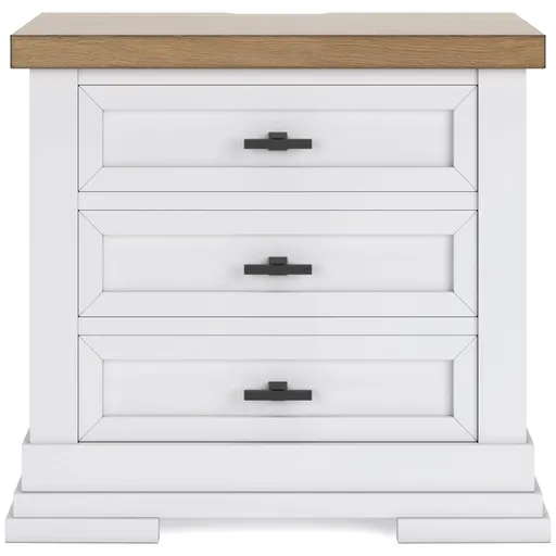 Casual style with substance. This two-tone nightstand raises the bar on comfortably cozy design in your soothing sanctuary. A sturdy silhouette with a classic white finish and black metal hardware exudes modern farmhouse vibes. The butcher block oak veneer top adds a relaxed aesthetic. And bedside charging for your go-to devices is made easy with power outlets and USB ports.