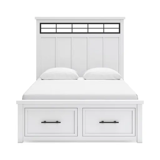 This queen panel storage bed delivers casual style with substance. An inset metal detail on the headboard displays a unique take on modern farmhouse design. The bed's sturdy silhouette, classic white finish and black pulls exude a comfortably cozy vibe in your soothing sanctuary. Storage drawers are spacious enough for all your essentials.