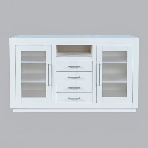 Contemporary design meets ample storage in the Auburn Hills 50 Inch Console. A bold frame and sleek bar hardware pair with tempered glass cabinet doors, perfect for storing items that you want tucked away, but still visible. Each cabinet has 2 adjustable shelves, so you can make sure it fits everything you need it to. And anything you want out of sight but still in reach can be put in one of the 4 center drawers. This modern TV stand is easy to assemble and at 50 inches wide, is function and style for any size space.