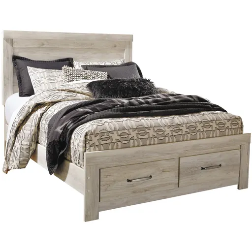 It's gorgeous; it's modern farmhouse; it's this queen storage bed. Wispy, whitewash finish infuses so much character without covering the grain for that weathered, rustic look you crave. Clean-lined, classic panel styling and a pair of drawers at the foot of the bed provide a countrified-chic bedroom retreat that's a breath of fresh air. Mattress available, sold separately.