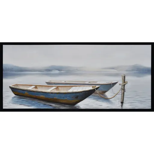 Set sail with the Boat II Wall Art. Complementing its pair, this large framed painting depicts a tranquil marina scene in soft blues and neutrals. A standout piece for coastal or casual spaces. Made in Canada and ready to hang.