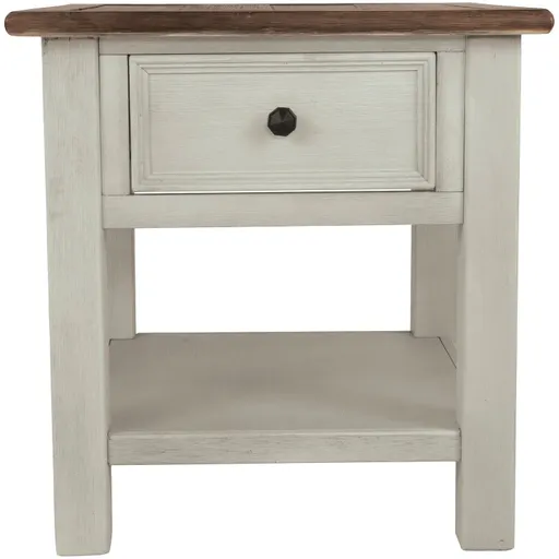 The Bolanburg end table complements your farmhouse, shabby chic or country cottage décor to perfection. This two-tone accent table has a plank-and-frame style top, a gently distressed whitewash finish, and a smooth-gliding drawer with a faceted black knob. You'll appreciate the convenience and love the look of this rectangular end table. Crafted of select white oak veneers, wood and engineered wood.