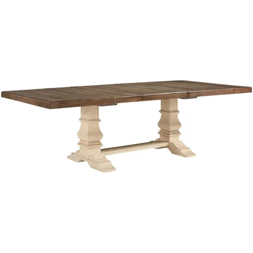 Whether your style is farmhouse fresh, shabby chic or country cottage, you'll find the Bolanburg extension dining table works on so many levels. The table's two-tone finish, with weathered gray on the tabletop and textured antiqued white on the double-pedestal base, offers twice the character and twice the appeal. An extension leaf makes it easy to comfortably add more guests in no time.