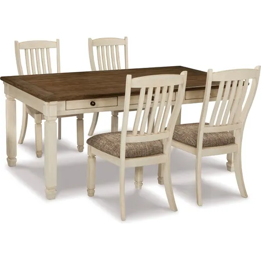 The beauty of this dining package is something to savor. A two-tone textural finish gives the rectangular dining table with plank-effect top a double helping of charm. Six drawers built into the table apron allow you to keep placemats, napkins and utensils right on hand. Designed to serve up comfort and flair, the rake-back dining chairs entice with cushioned seats covered in a heavy woven fabric that complements the antiqued white finish.