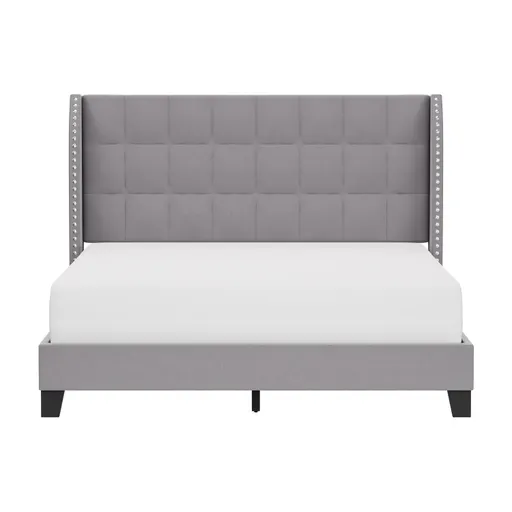 Luxuriate in a five-star hotel experience without leaving your bedroom in this Upholstered Queen Platform Bed with a tufted wingback headboard that feels like dream. Wrapped in a neutral smoke gray fabric and styled with nickel nail head trim detail, this transitional glam queen bed means you can change the décor of your happy place without having to swap out its star. Plus, two dual USB ports allow you to recharge devices while you recharge. Includes bed frame with slats, no box spring needed. Requires one queen mattress, not included. Assembly required.