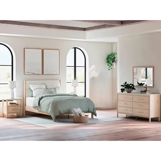 Create a calm, modern retreat with the Cadmori Room Group. Featuring a replicated wood grain finish, textured polyester upholstery, and round post legs, this 4-piece bedroom set combines soft tones with strong structure. Includes bed, dresser, mirror, and nightstand for a complete look.