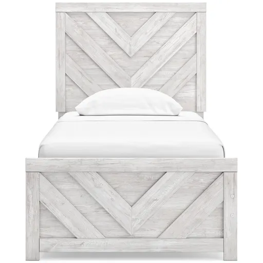 Charmingly designed, this twin panel bed embraces the aesthetics of countryside living and repurposes them for modern settings. Its whitewash paint appeals to your love of vintage character, while a chic chevron pattern on the headboard and footboard keeps your bedroom effortlessly on trend.