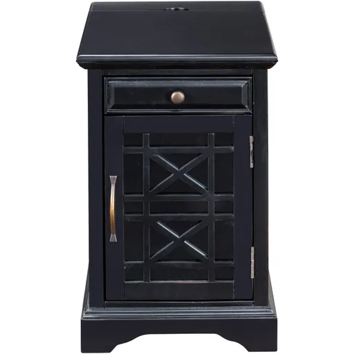 The Chilton power chairside table may look like an antique, but it's made for today's lifestyles. You'll appreciate the carefully aged finish, cabinet door fretwork, and antiqued hardware, but it's the hidden USB port and power outlet that makes this end table a real treasure. With a handy drawer and door compartment, this table gives you just the right amount of chairside storage. Two USB ports and two power outlets. Made of engineered wood.