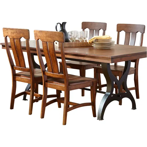 The District 5 Piece Counter Dining Set will welcome family or friends to any meal. All pieces are beautifully handcrafted using solid birch and finished in a cool copper lacquer. The cast metal table base provides a slight industrial touch against the bench legs that are fashioned after an antique sewing machine. The four splat back chairs included in the set include side stretchers for added strength.