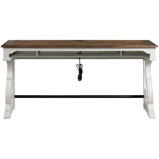The Drake Bar Table boasts a traditional mission style and comes in an updated rustic white and stone finish. With a hidden shelf and electrical outlet, this bar is versatile and functional, and it can accommodate up to 3 bar stools so there is plenty of room for friends.