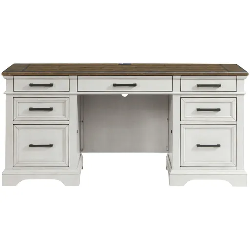 Drake Home Office offers a classic old world style, all case pieces have rustic oak plank board tops. This two-toned finish combines a relaxed antiqued white finish with warm rustic oak patina. Solidly constructed and designed to function the way we work today