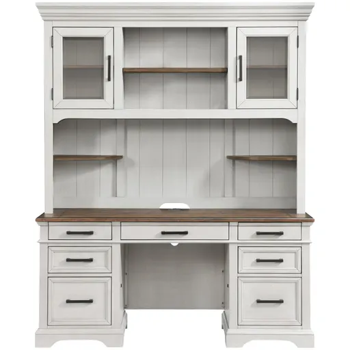Drake Home Office offers a classic old world style, all case pieces have rustic oak plank board tops. This two-toned finish combines a relaxed antiqued white finish with warm rustic oak patina. Solidly constructed and designed to function the way we work today