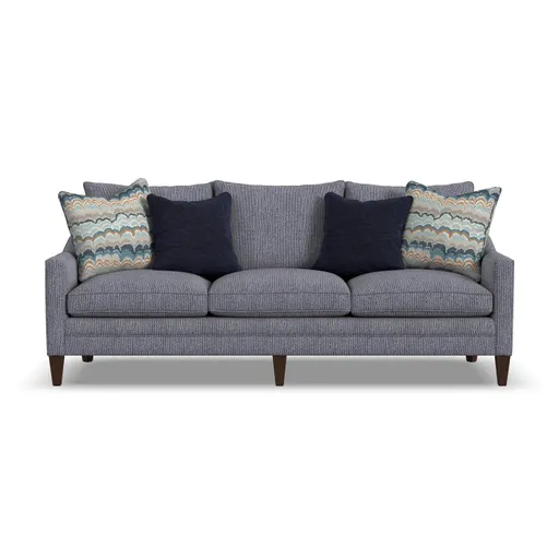 Curved elegance meets inviting comfort in the beautifully tailored Eleanora sofa. Its gently rounded back flows seamlessly into sloped track arms, creating a graceful silhouette that feels timeless and refined. Deep, welt-trimmed seat cushions rest atop a split front rail, offering a plush retreat perfect for curling up with a book or cup of coffee. Supported by dark brown tapered legs and adorned with four feather-filled accent pillows, Eleanora is a captivating blend of style and softness.