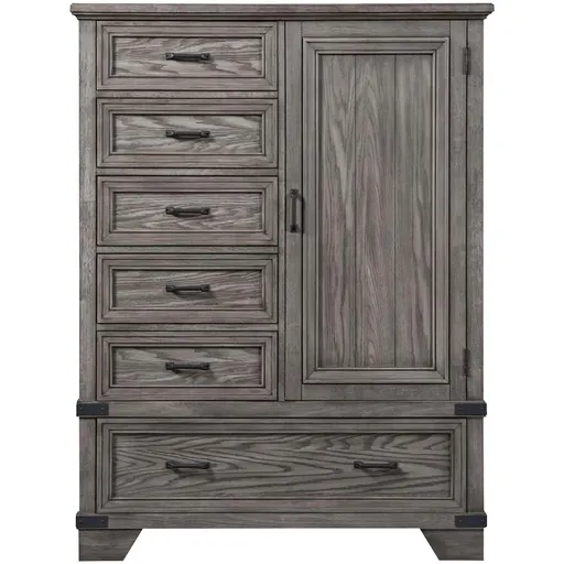 The Forge Gentleman's Chest has a distinguished wire-brushed steel gray finish that will catch some eyes. Constructed from oak veneers and hardwood solids drawer storage will never be a problem with this spacious chest in your room. The drawers have English dovetail construction, and the drawer fronts each have a metal pull. The gray neutral tone ca n fit with your existing furniture. The Forge Gentleman's Chest was brought to us by the furniture experts at Intercon Furniture, and we are proud to offer it to you at your local Slumberland Furniture Showroom.