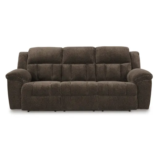 The Frohn Reclining Sofa delivers casual comfort with smooth pull-tab recline, pillow-style armrests, and attached cushions. Its corner-blocked frame and metal-reinforced seat ensure long-lasting support, while soft polyester upholstery adds everyday softness in graphite or chocolate finishes.