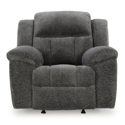 The Frohn Rocker Recliner blends motion and comfort with smooth rocking action and easy pull-tab reclining. Thick cushions, pillow-top arms, and reinforced framing make this recliner a durable choice for living spaces that value both relaxation and function.