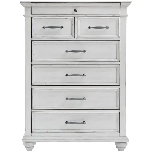 Give your retreat vintage charm with this 7-drawer chest. Sporting a beautifully distressed whitewashed finish, it includes seven varied-sized drawers for an organized wardrobe. Generously scaled moulding from top to bottom, along with bun feet and drawer handles with a transitional aesthetic, give this chest character—invoking the feel of a quaint cottage escape.