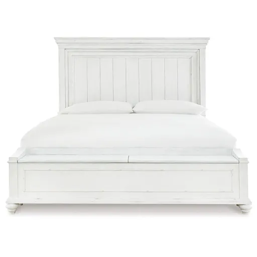 Give your retreat vintage charm with this queen panel bed and storage footboard. In a beautifully distressed white-washed finish, you'll love the headboard's grand style featuring a picture framed panel. The bench footboard is equally elegant offering extra storage and a convenient seat. Generously scaled moulding from top to bottom, along with bun feet give this bed character—invoking the feel of a quaint cottage escape.