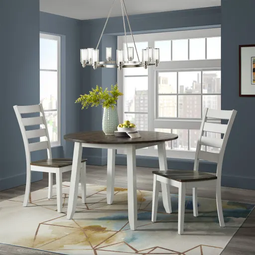 The Kona collection is perfect for everyday dining. Constructed of select hardwoods and solid mango – a sustainable wood that's densely grained, strong and sturdy – this set has an easy, semi-traditional look that's as casual or as formal as you'd like to make it. The updated ladderback chairs have padded vinyl seats and smooth curved backs, inviting diners to linger at the table. A gray and white combination finish highlights the collection.