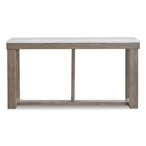 This sofa table is simple in design but big on style. Finished with a trend-right grayish brown wood tone, its bold, blocky profile and natural marble top are timeless classic choices that is ideal for pairing with an ottoman underneath to pull extra seating into the room or remaining clean and sleek on its own. Adding to its beauty, the marble top's color variations, fissures, mineral deposits and veining are naturally formed and are not defects.