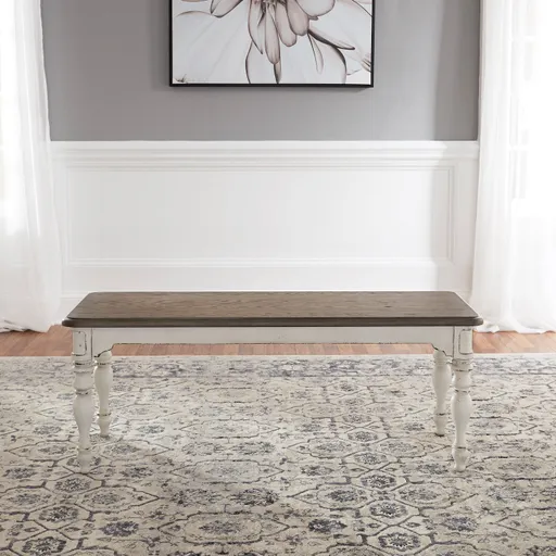 Customize your dining room with the versatile Magnolia Manor Dining Bench. Cozy up around the table to enjoy a meal with loved ones, or use this bench to display your favorite décor for a more artistic vibe. With its antique finishes and subtle distressing, this piece fits in beautifully with any style, from rustic to urban, and everything in between.