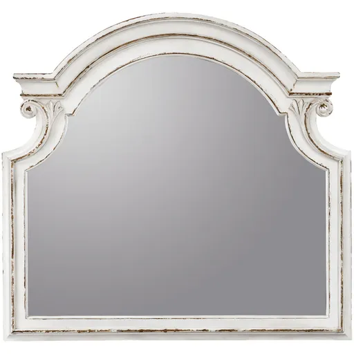This Magnolia Manor mirror attaches to the Magnolia Manor dresser. Crafted in the grand European tradition, this dresser mirror has graceful scalloped edges and artistic distressing for a shabby chic elegance that never goes out of style. Made of beveled glass, it has an antique white frame made of poplar solids and white oak and birch veneers.